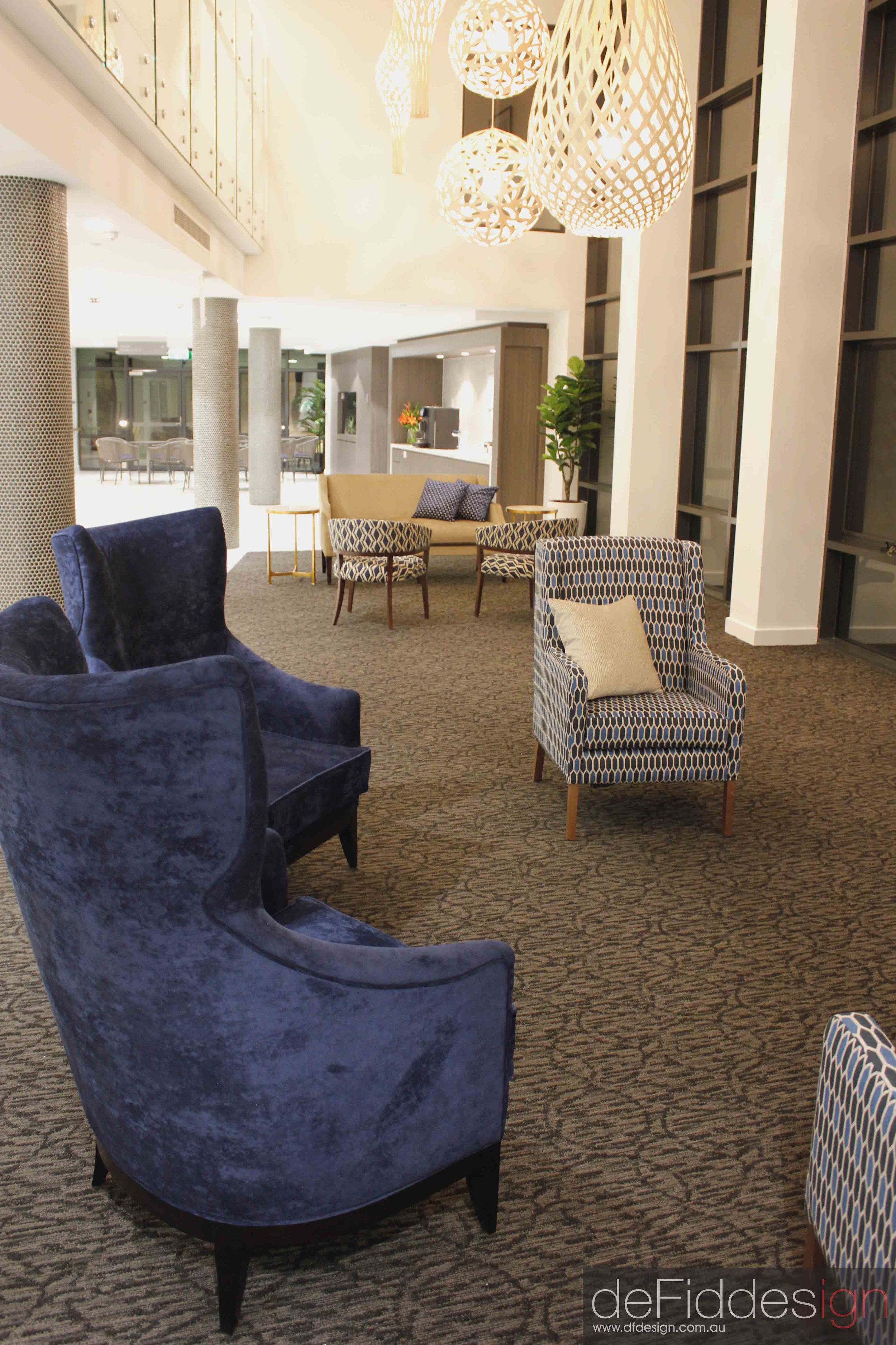 Sophisticated furniture and window treatments were carefully selected to give specific meaning and theming to each area of the facility, just as you would in your own home. Complimenting this, a selection of hand picked accessories and framed artworks for resident familiarisation and wayfinding, an important consideration in these environments.